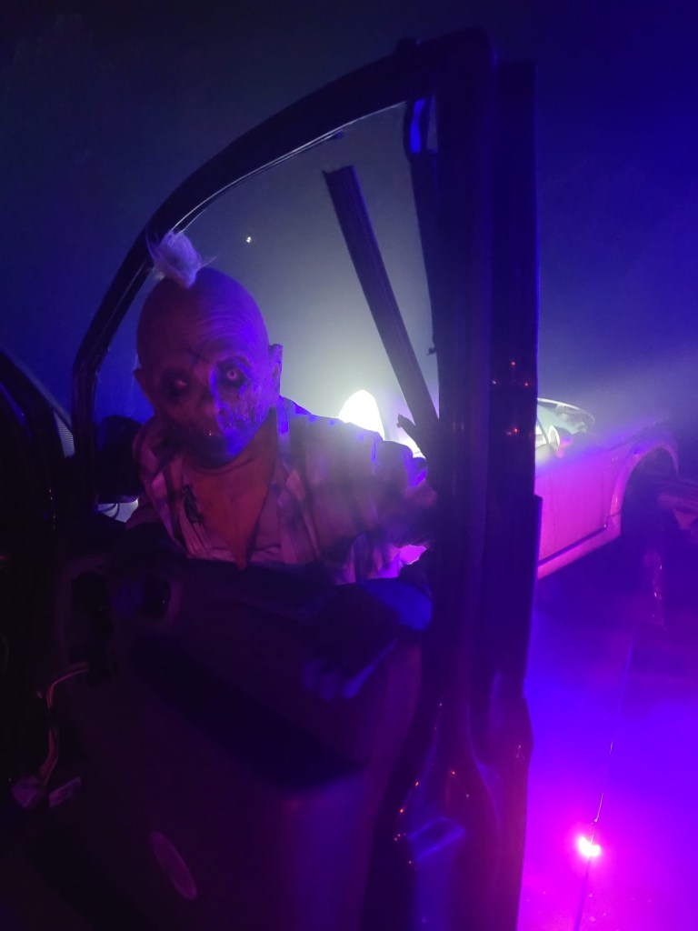 Unpredictability is crucial for every guest, causing them to underestimate the situation and the chances of a surprise. One primary technique employed by scare performers is the art of diverting attention or misdirection. For instance, I was stationed in a junkyard filled with discarded, wrecked cars. My jump scare involved leaping out of a van, which might seem simple, it was rather predictable given that the van’s door was wide open. Fortunately, I collaborated with another actor for this particular scare. He would be stationed on the floor to the left hand side while my van was on the right, leading visitors to navigate around him. As their attention is diverted away from the van onto the other actor they are completely overlooking the wide-open van with someone inside. Timing is the key for success here, allowing you to frighten the entire group if you’re fortunate. It demands patience and precision.