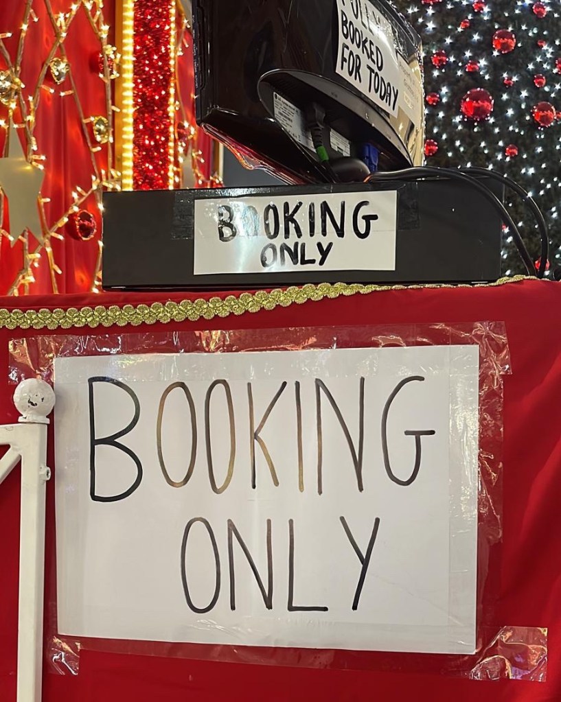 As a Grotto Manager, I’m very assertive and apply rules I believe are beneficial, learning from my past seasonal work experiences. In 2023, I laid out these ground rules; in the grotto, please limit families to two professional photos (unless it’s a baby), ask them to choose one combination for the camera, and remind them they can take unlimited photos on their phones to help speed up visits and avoid personalised photo requests.